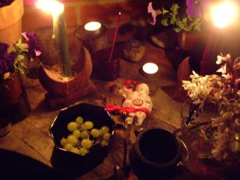 Der Altar oder den Platz der Anrufung mit Symbolen der Weiblichkeit, wie Schalen und Tassen, Kelche (stehen für den weiblichen Schoß)  Blumen, Mond-Objekte, Fische und Tauben oder Schwäne schmücken.