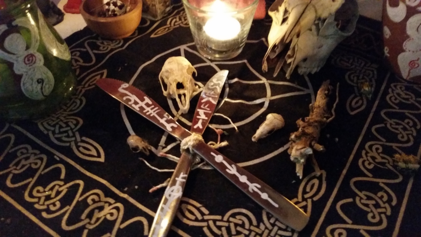 Nun müssen beide Messer über Kreuz gelegt, mit einem festen Band zusammengebunden und gut verknotet werden. Das Band sollte mindesten 3 Knoten als Abschluss erhalten. Zu jedem der Knoten einen kleinen Zauberspruch sprechen, je nachdem was für Verstrickungen gelöst werden und welche positiven Ereignisse anschließend eintreten sollen.
